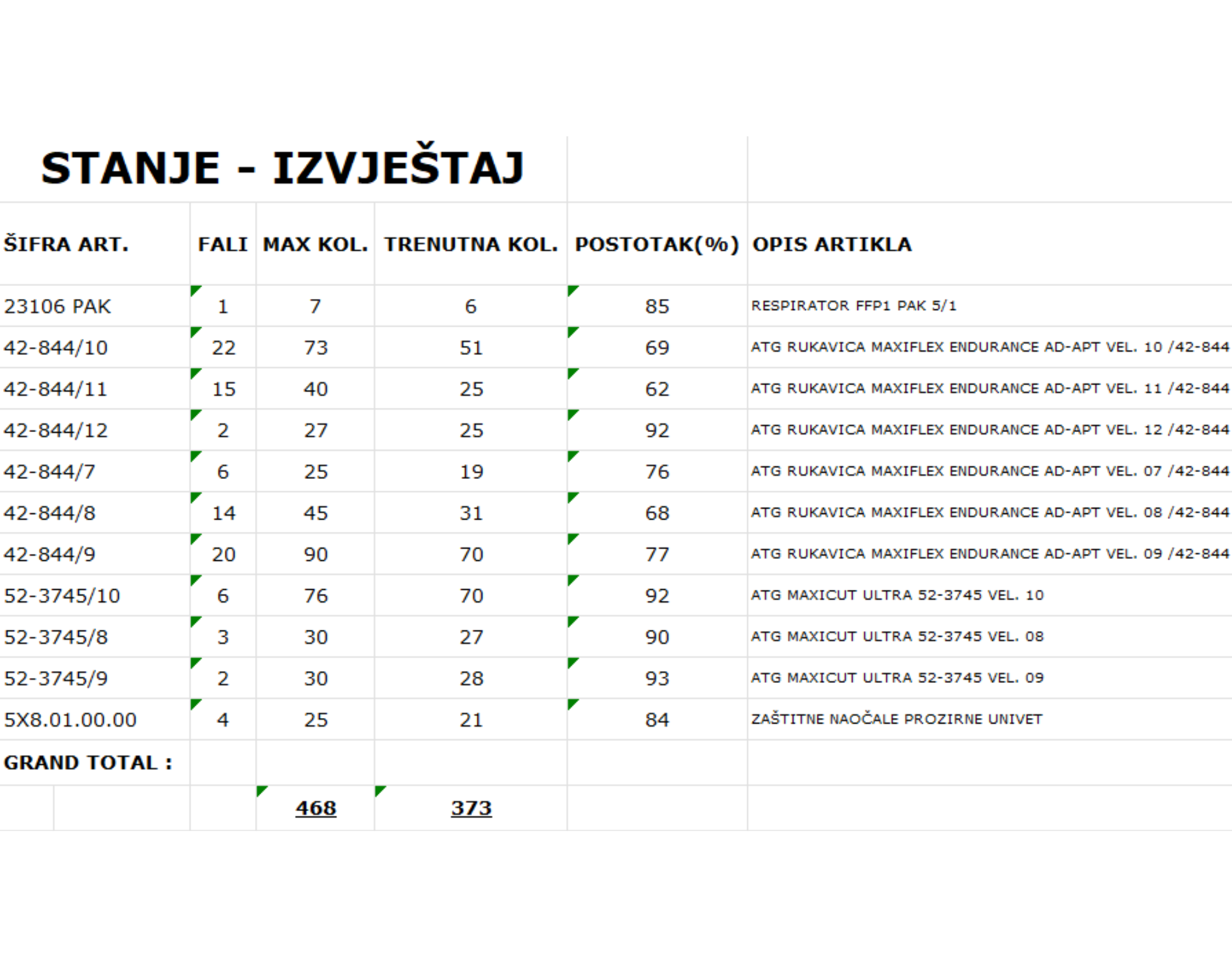 Druga vrsta izvještaja govori o trenutno dostupnoj količini pojedinih artikala u mašini.
